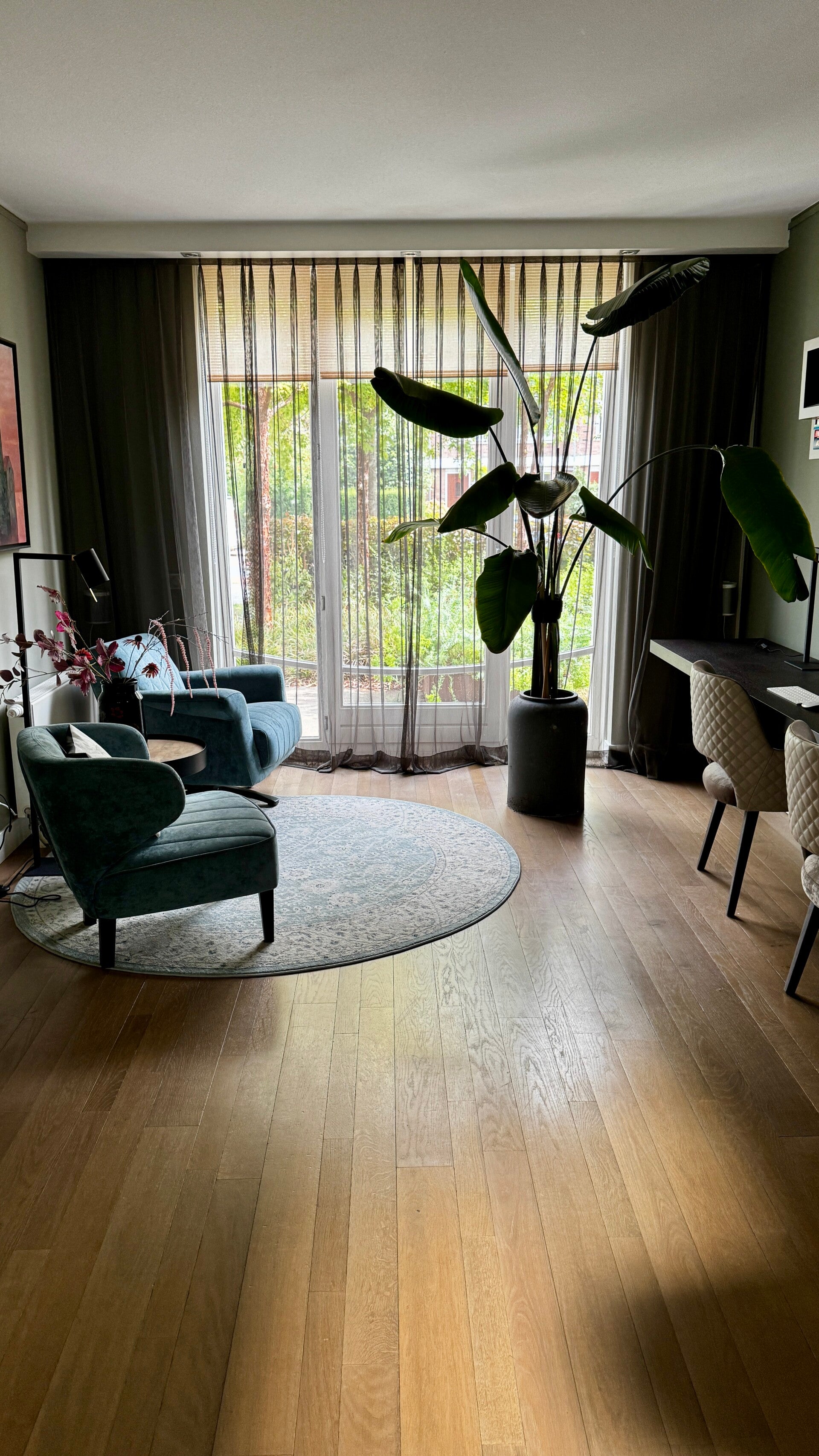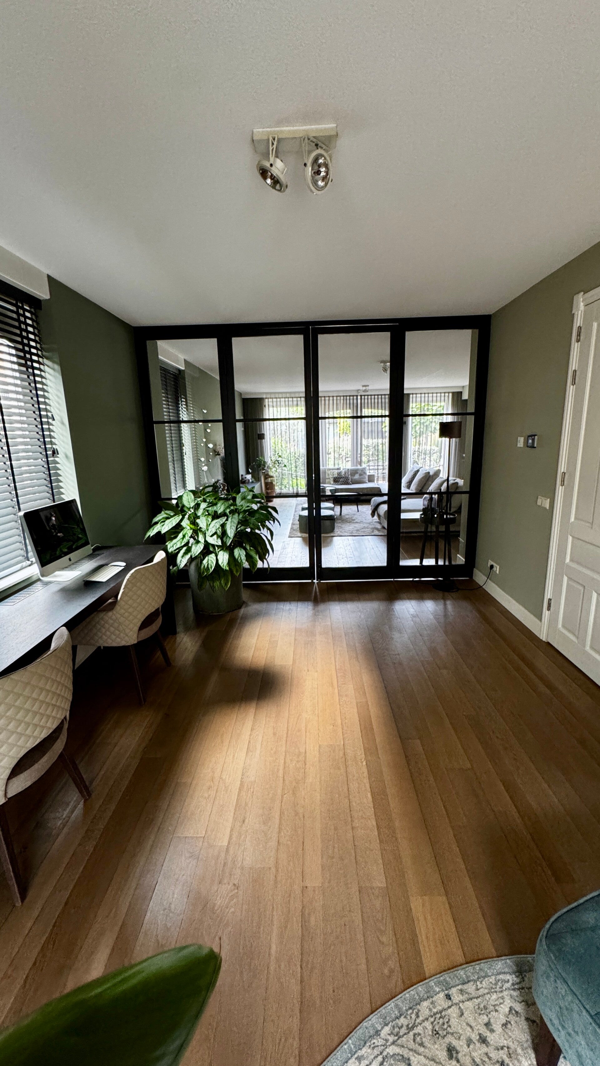 De hal verleent naar links toegang tot de voorkamer, tevens werkruimte, af te sluiten met tussendeuren. Naar rechts kom je in de woonkeuken met lange eettafel. Het is dus een rondloop die samen komt in de ruime woonkamer.