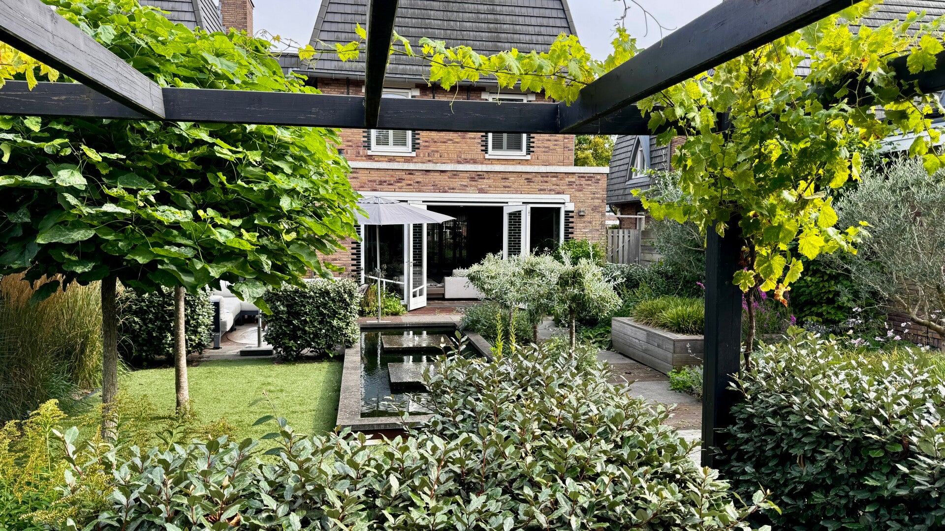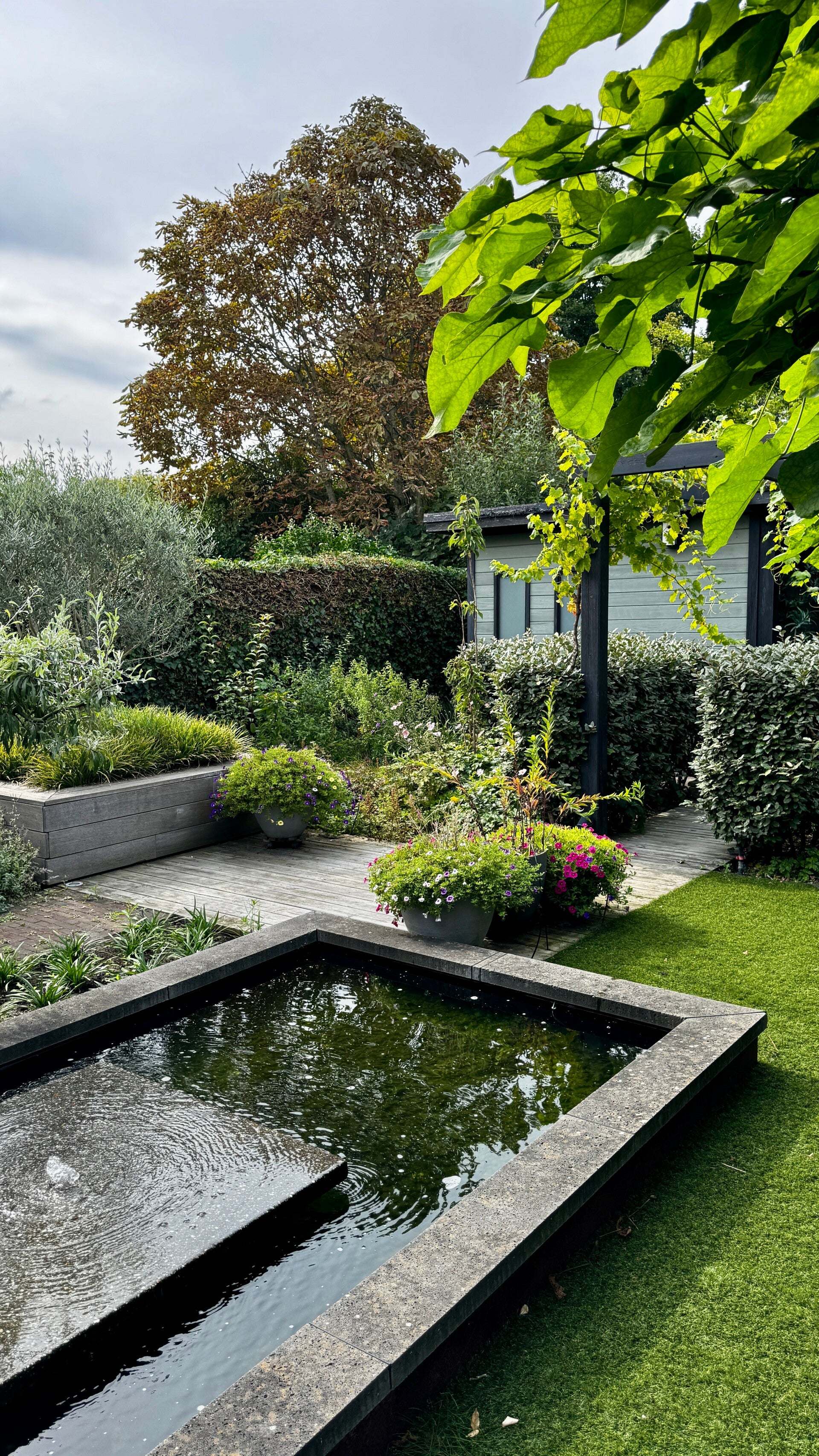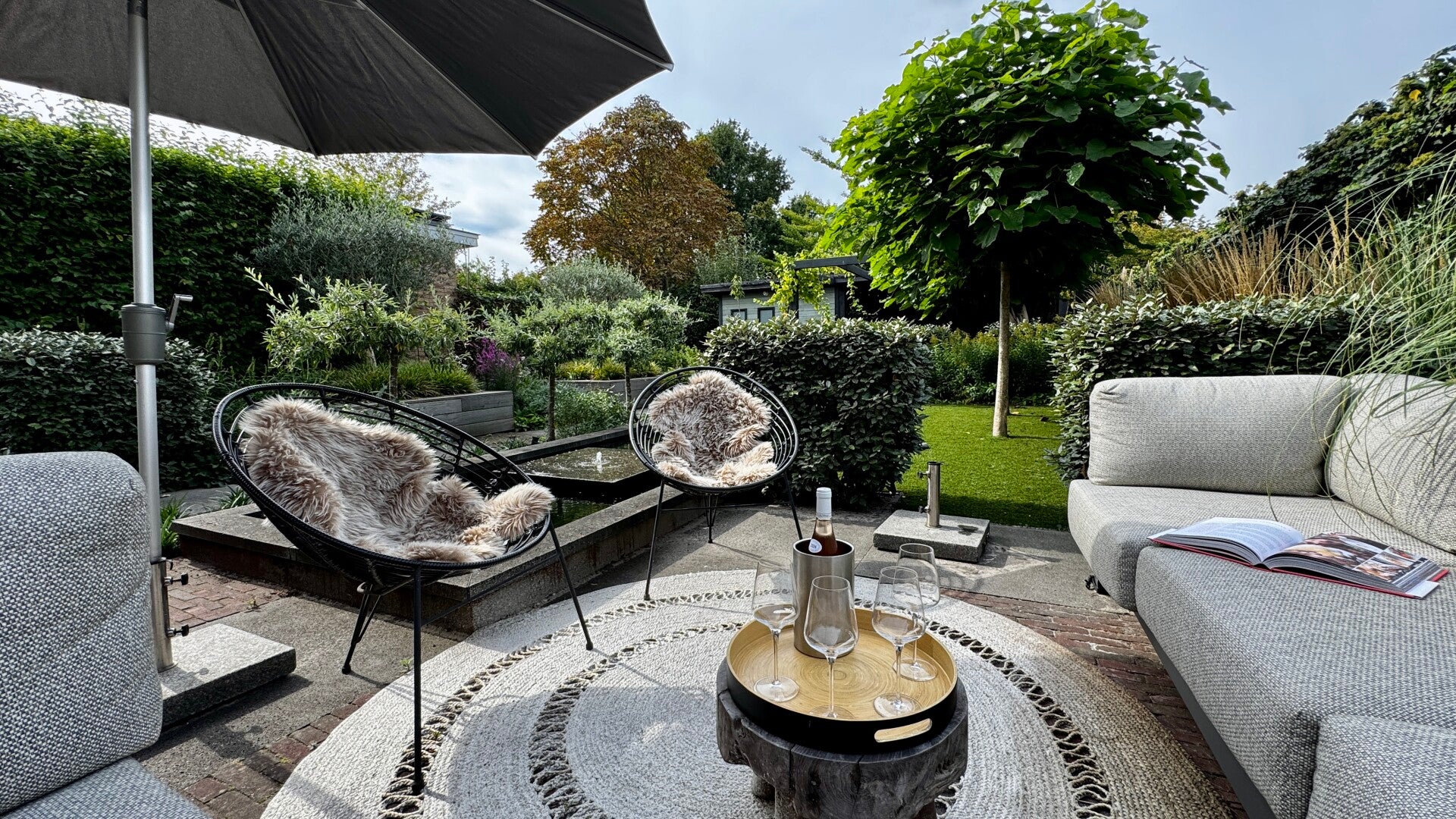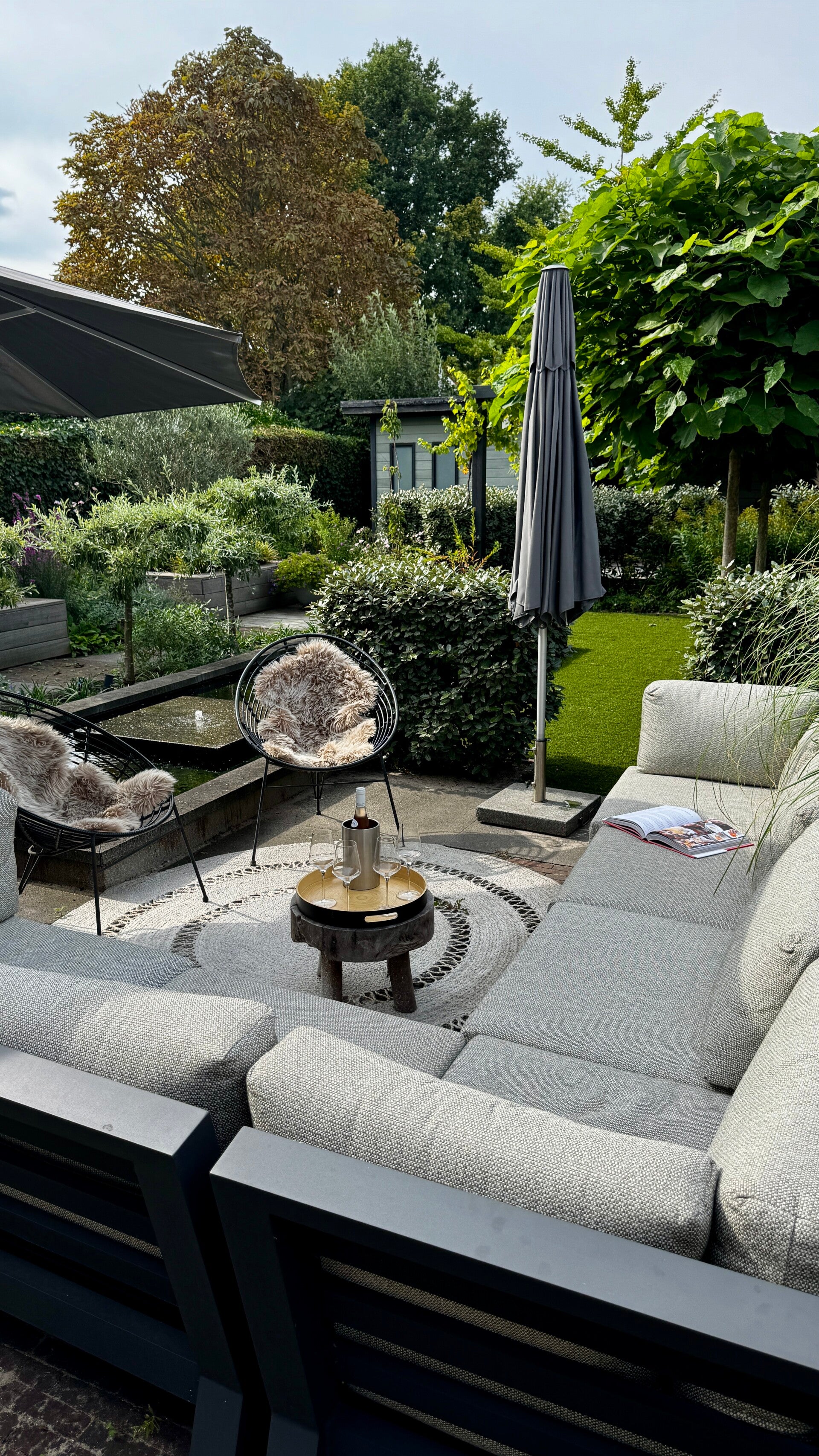 De tuin is ontworpen en aangelegd. Centraal in de tuin de waterpartij met 2 fonteintjes die zorgen voor een heerlijk ontspannende sfeer. Daar omheen terras.