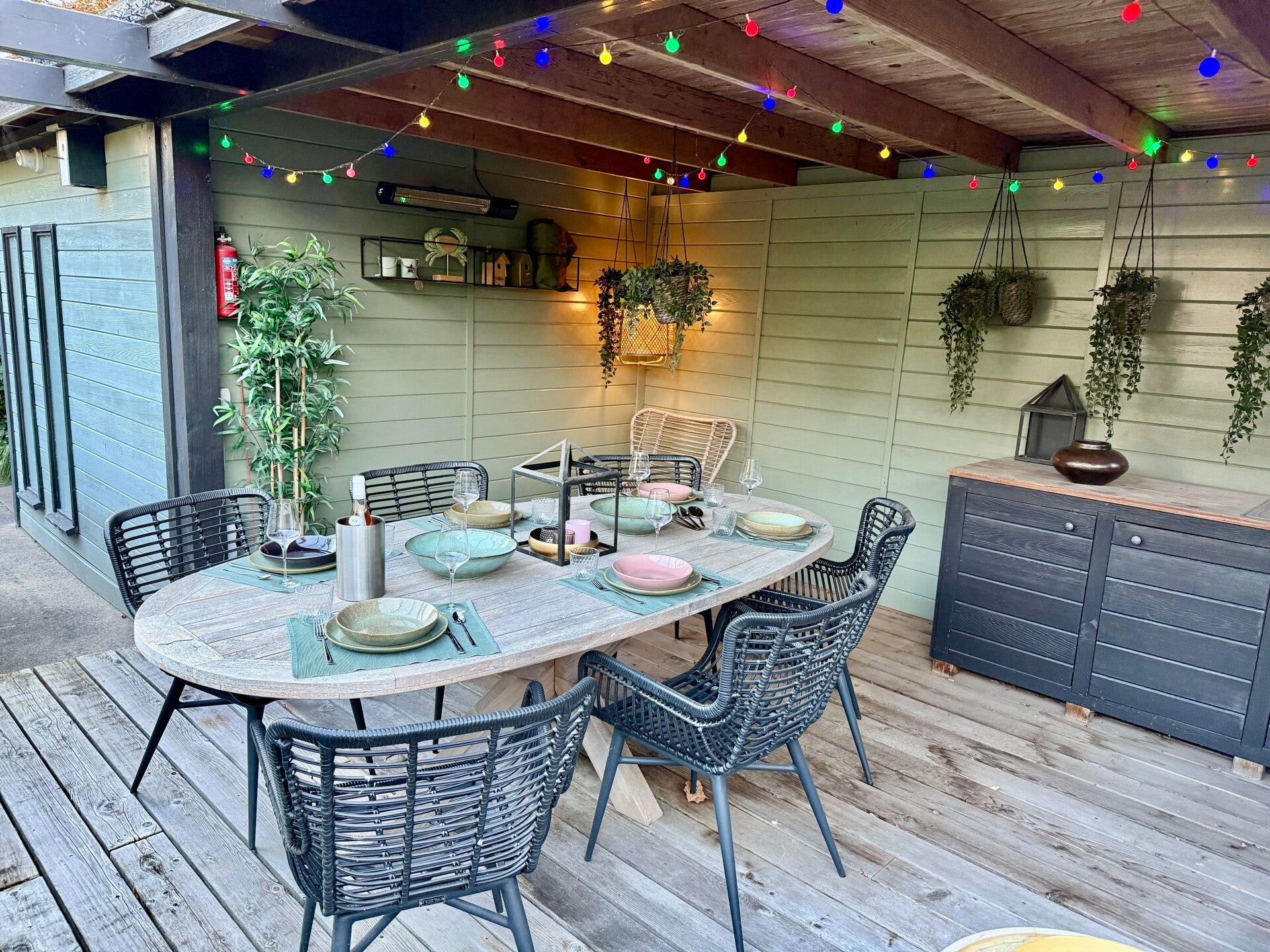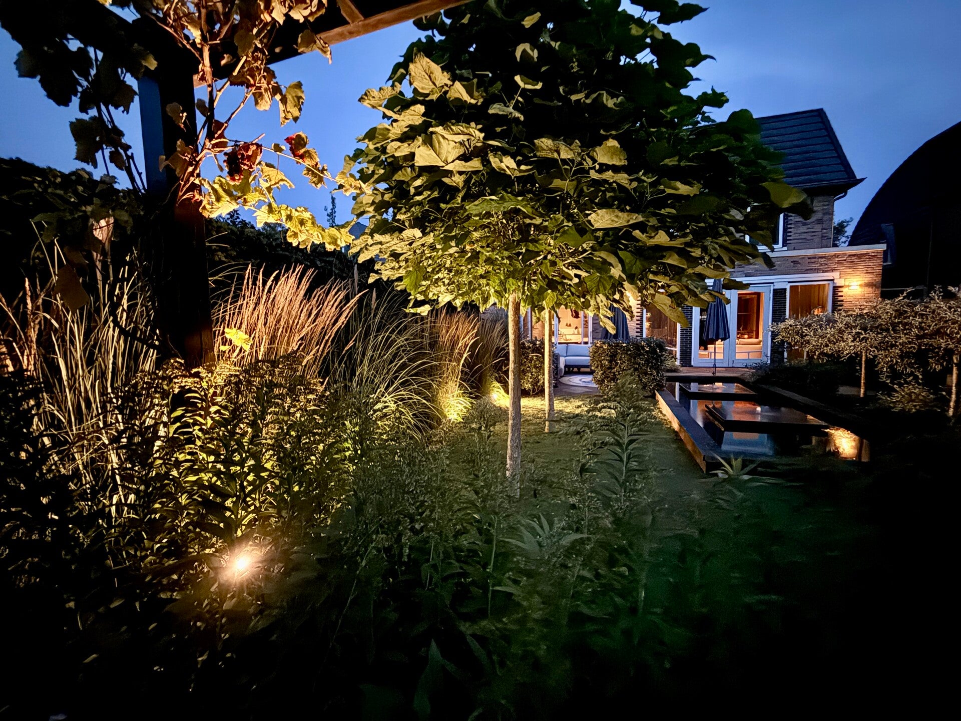 De tuinverlichting maakt het geheel in de schemering en avond helemaal compleet.